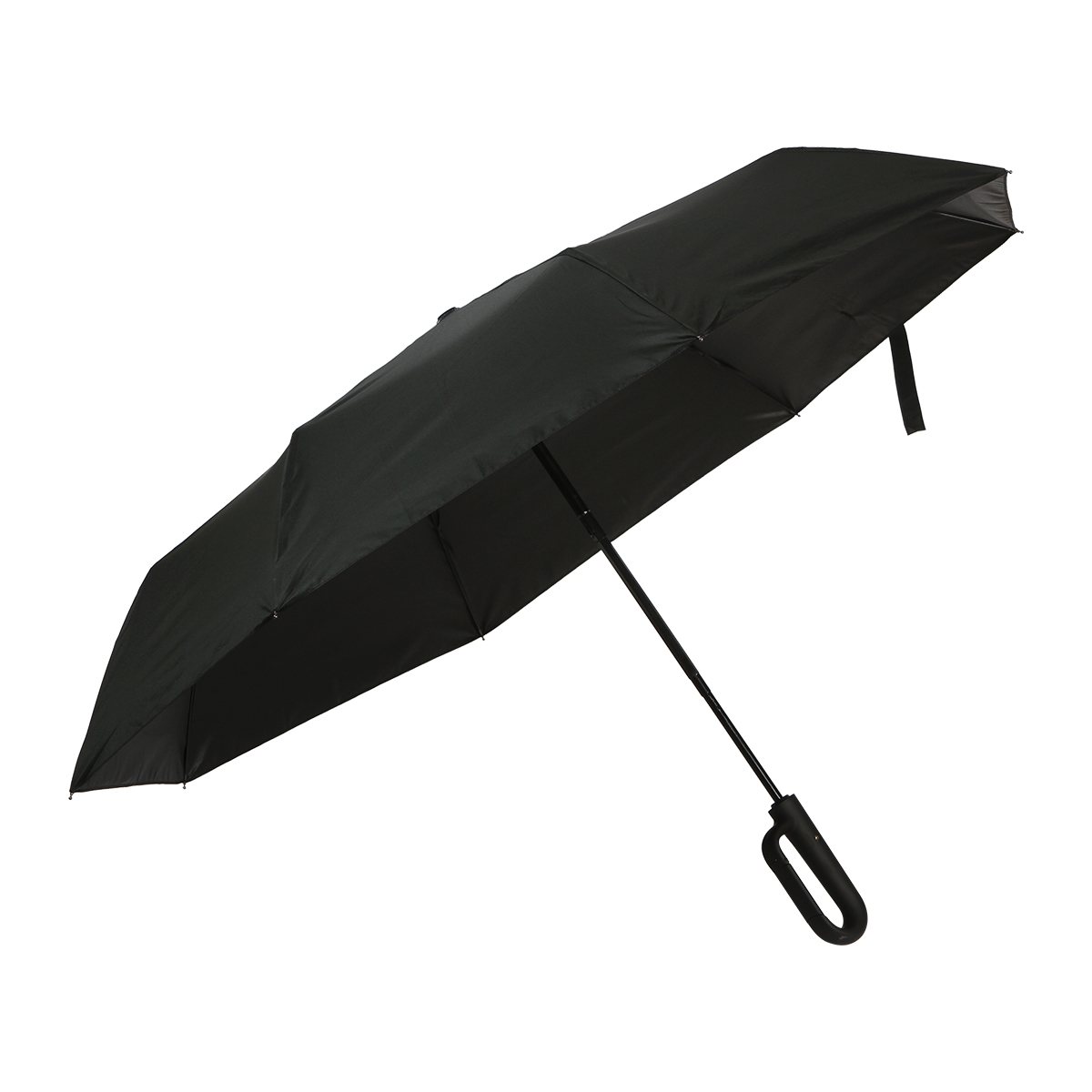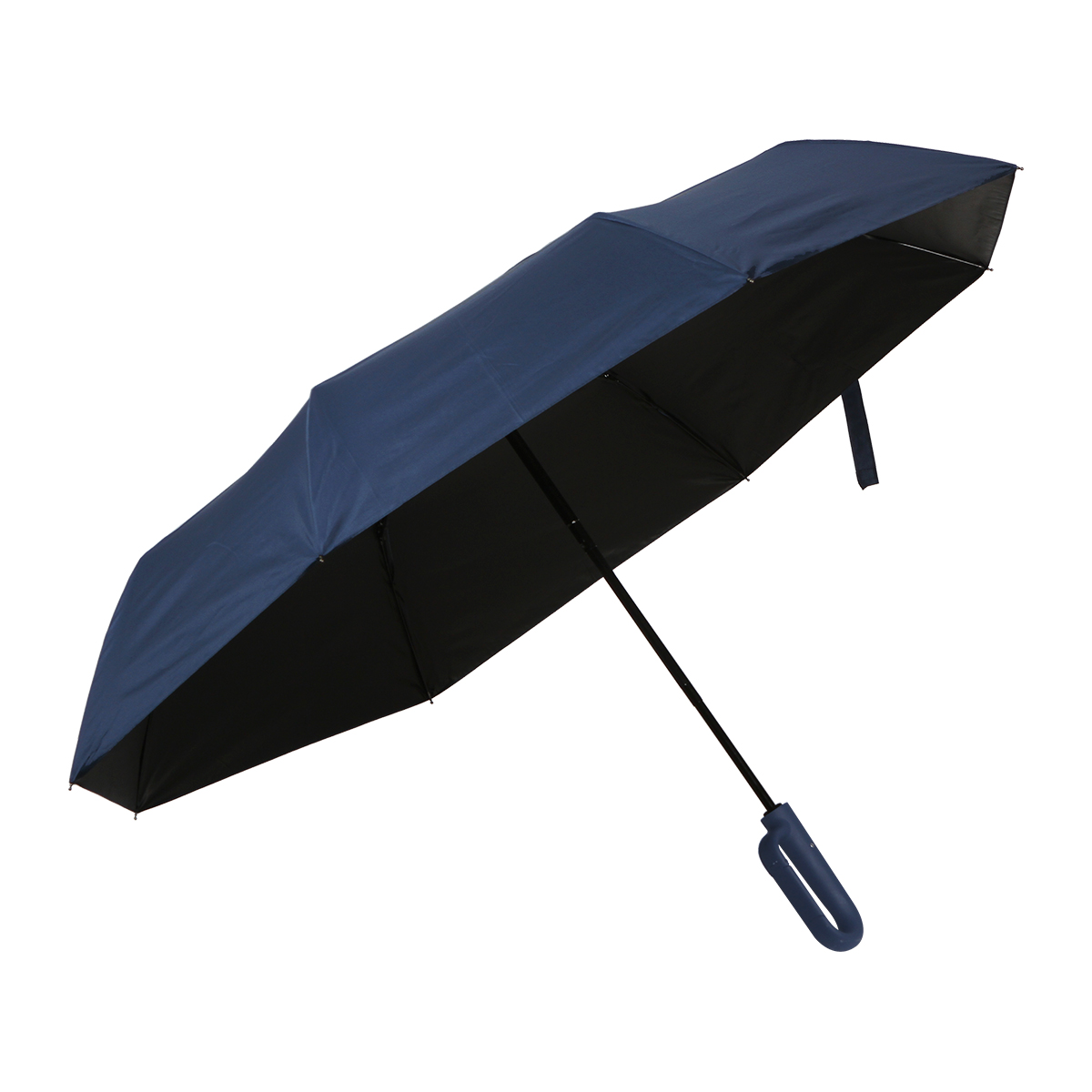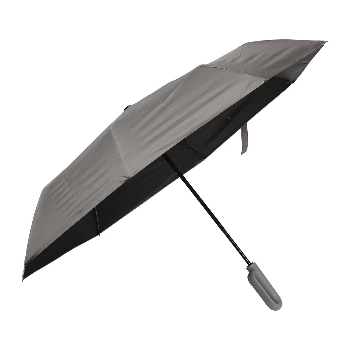 Paraguas fabricado en poliéster con costillas de metal, agarradera hecha de plástico ABS con acabado en poliuretano tipo goma, suave al tacto