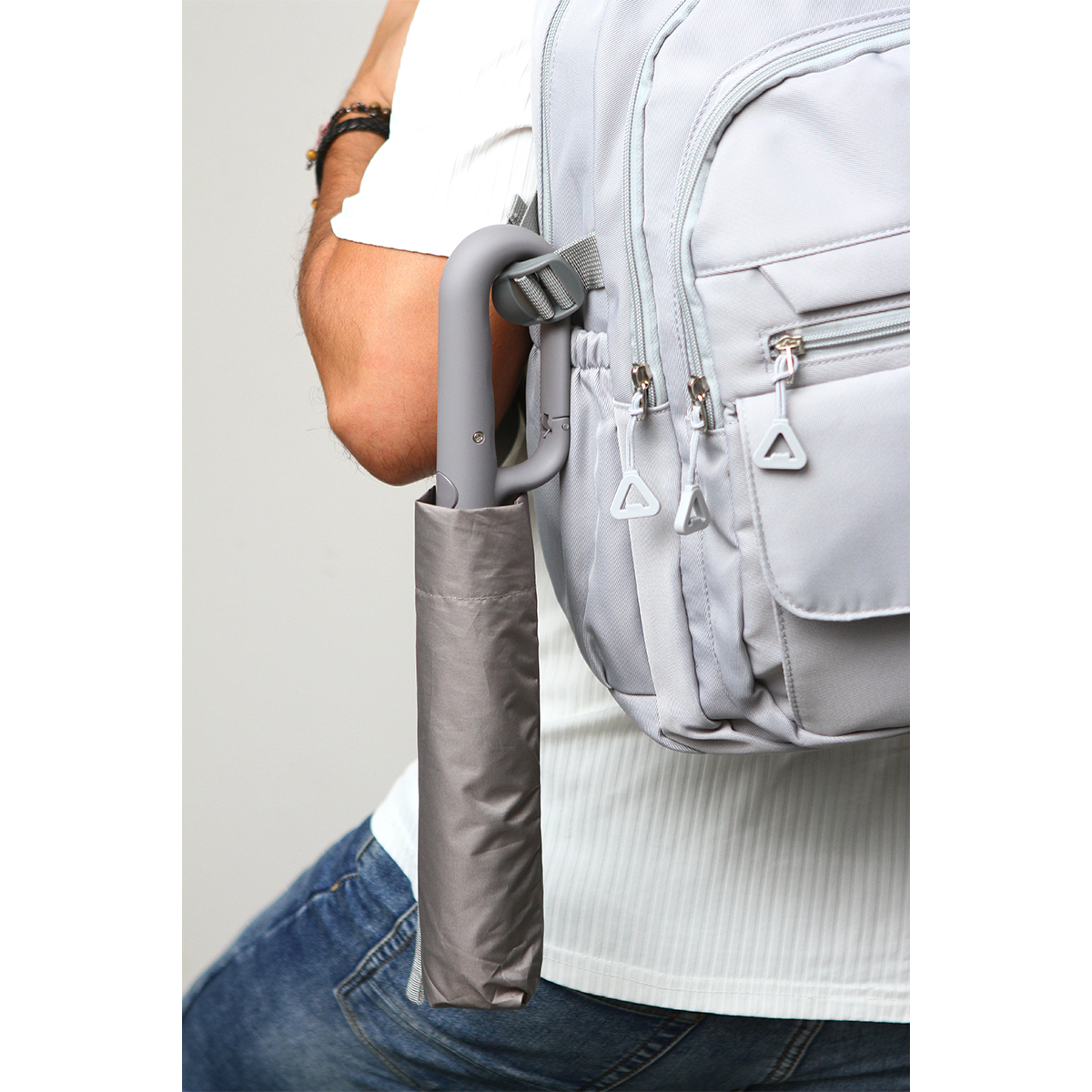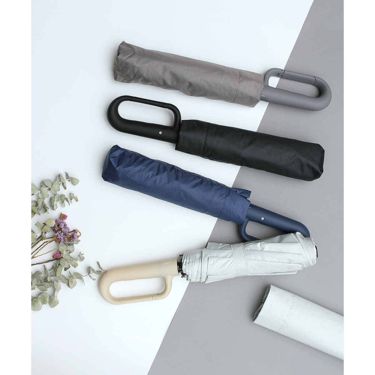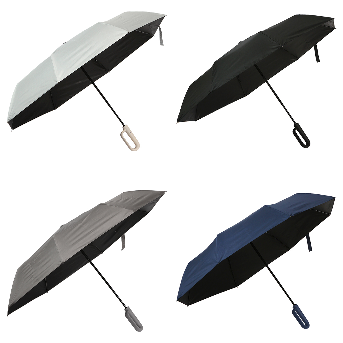 Paraguas fabricado en poliéster con costillas de metal, agarradera hecha de plástico ABS con acabado en poliuretano tipo goma, suave al tacto