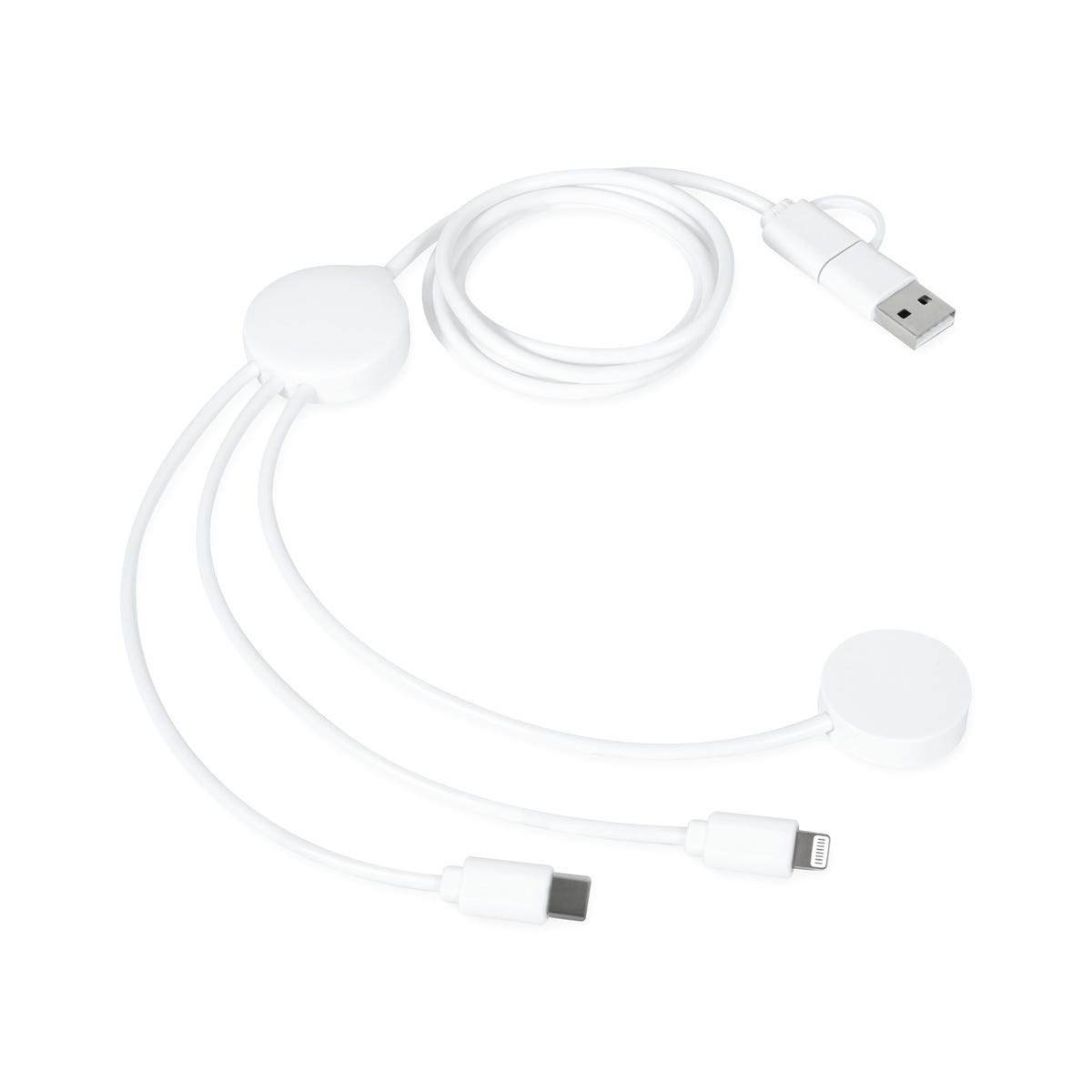 Descripción: Cable cargador 5 en 1. Incluye conector de entrada USB y tipo C, conector de salida lightning (8 pines), micro USB, tipo C y cargador inalámbrico para reloj inteligente.
