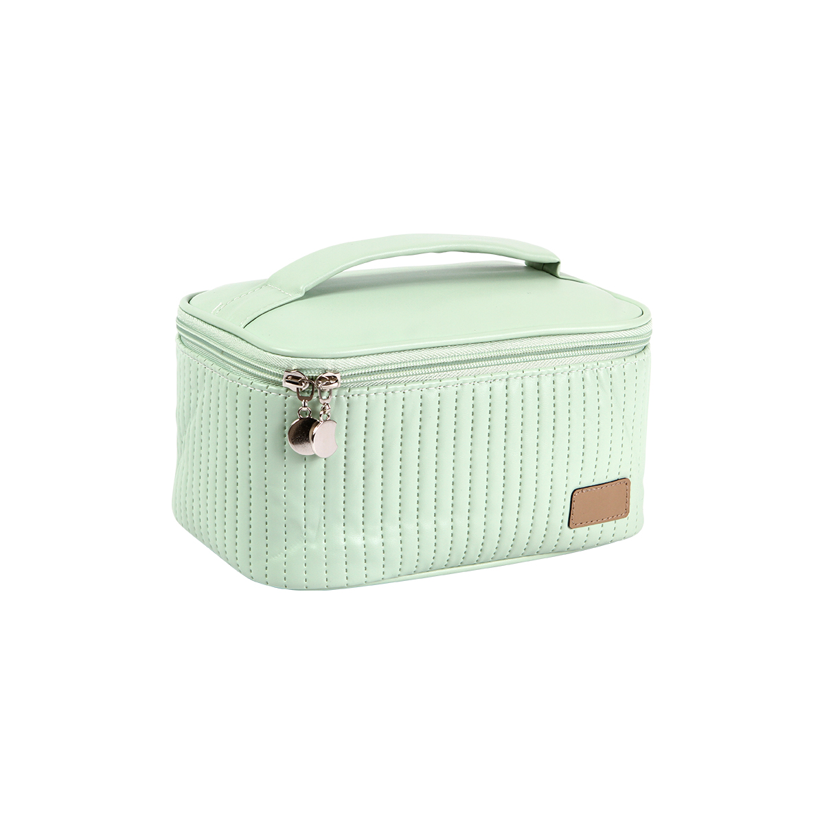 Bolsa cosmetiquera fabricada en curpiel y poliéster. Con tacto crema y asa, una cremallera, incluye bolsillos para cepillos de cosméticos. Diseño cuadrado con rayas.