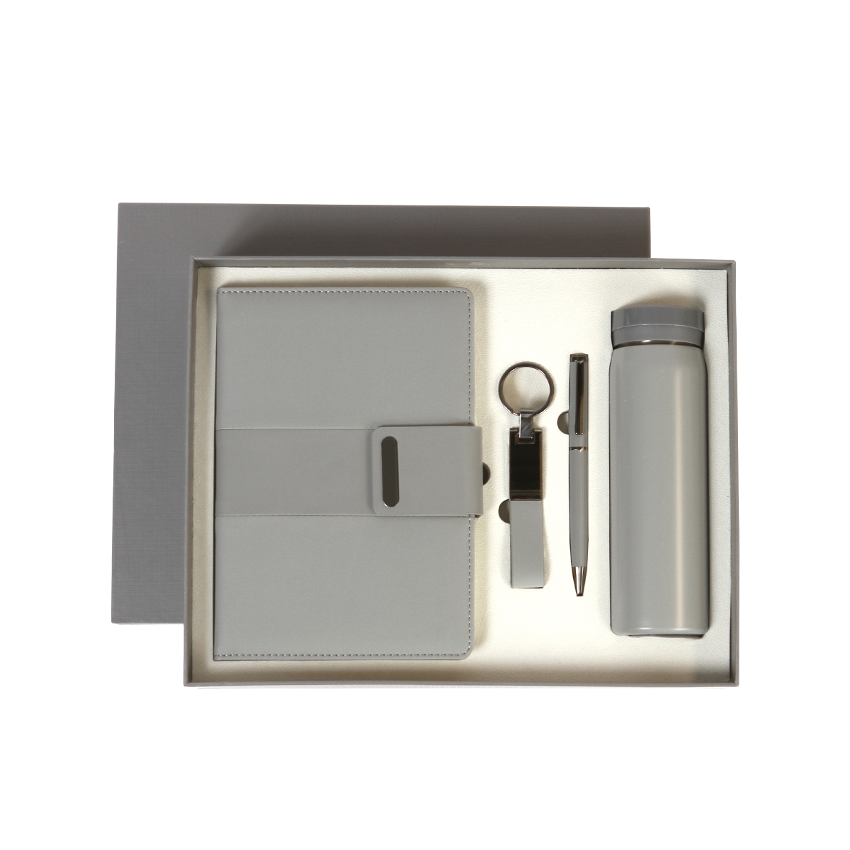 Set ejecutivo 4 en 1. Incluye libreta de 100 hojas de 80 g, bolígrafo tipo ball pen de acero inoxidable con tinta de escritura en color negro, llavero fabricado en PU y acero y termo de 350 ml fabricado en acero.