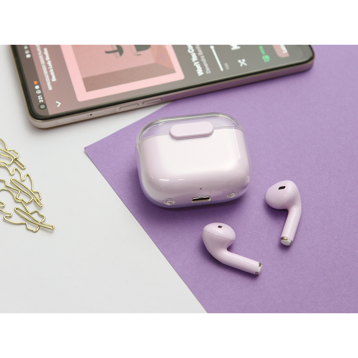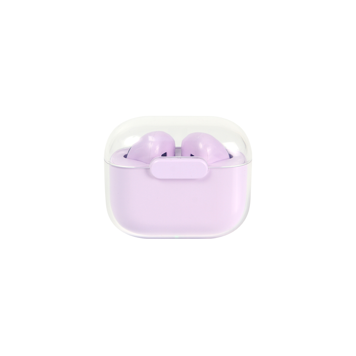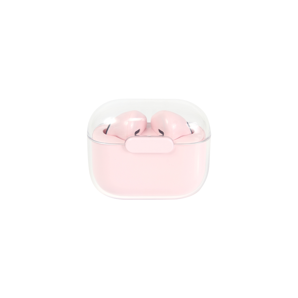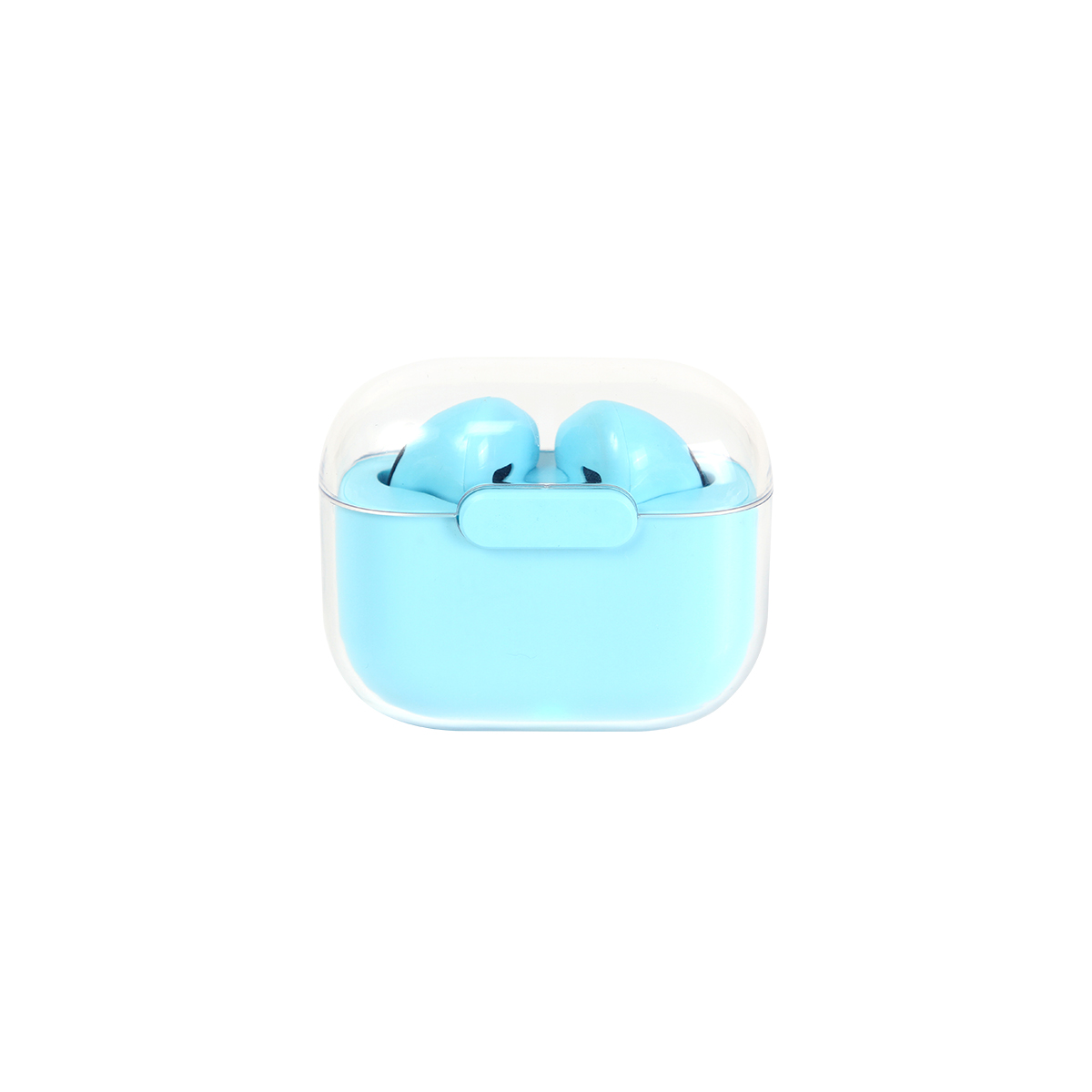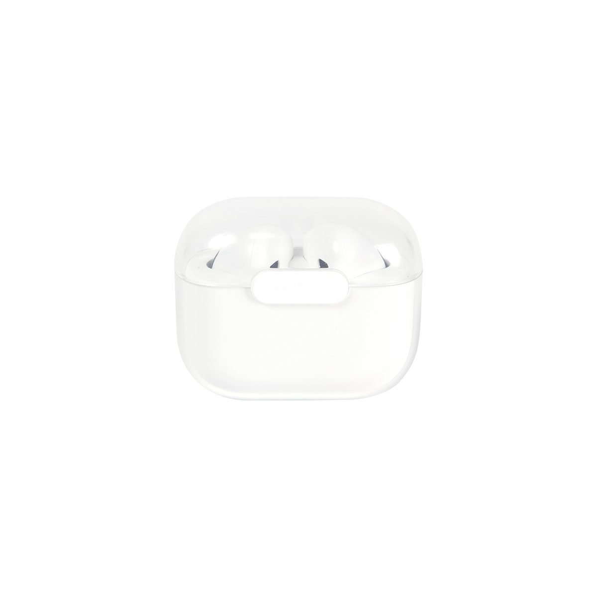 Set de audífonos con conexión de sonido sin cables, con estuche de carga. Distancia de transmisión de 9.9 m. Tiempo de reproducción de 4 a 5 horas. Puerto de carga tipo-C. Capacidad de batería de estuche de 250 mAh y de los audífonos de 30 mAh.