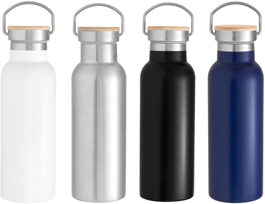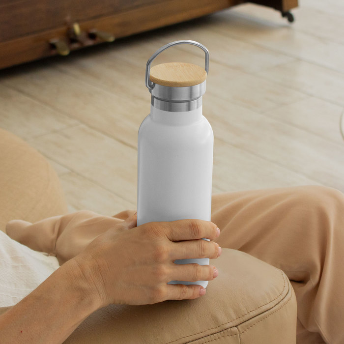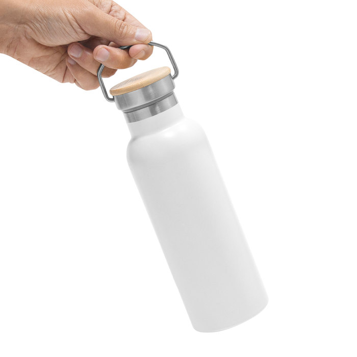 ,2 x 22,3 cm. Capacidad 550 ml. Acero inoxidable. Botella térmica doble pared sellada al vacío. Interior en acero 304 y exterior en acero 201. Tapa de acero inoxidable con manija metálica rebatible y detalles en bambú. Anillo de silicona antiderrame. Mantiene hasta 12 hs