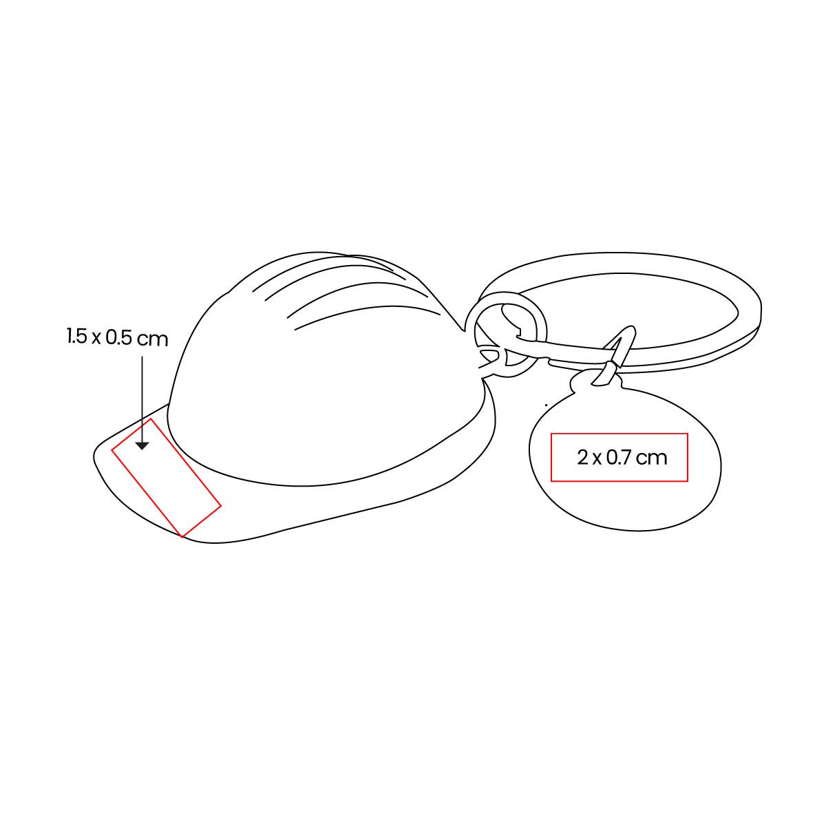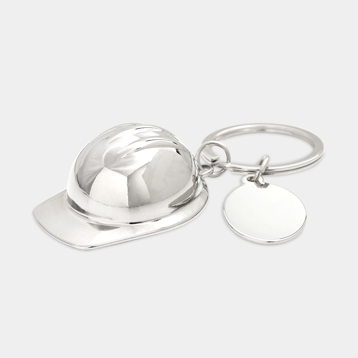 Llavero metálico con diseño en forma de casco. Accesorio perfecto para el sector industrial, construcción y seguridad. Incluye una placa ovalada para personalizar.