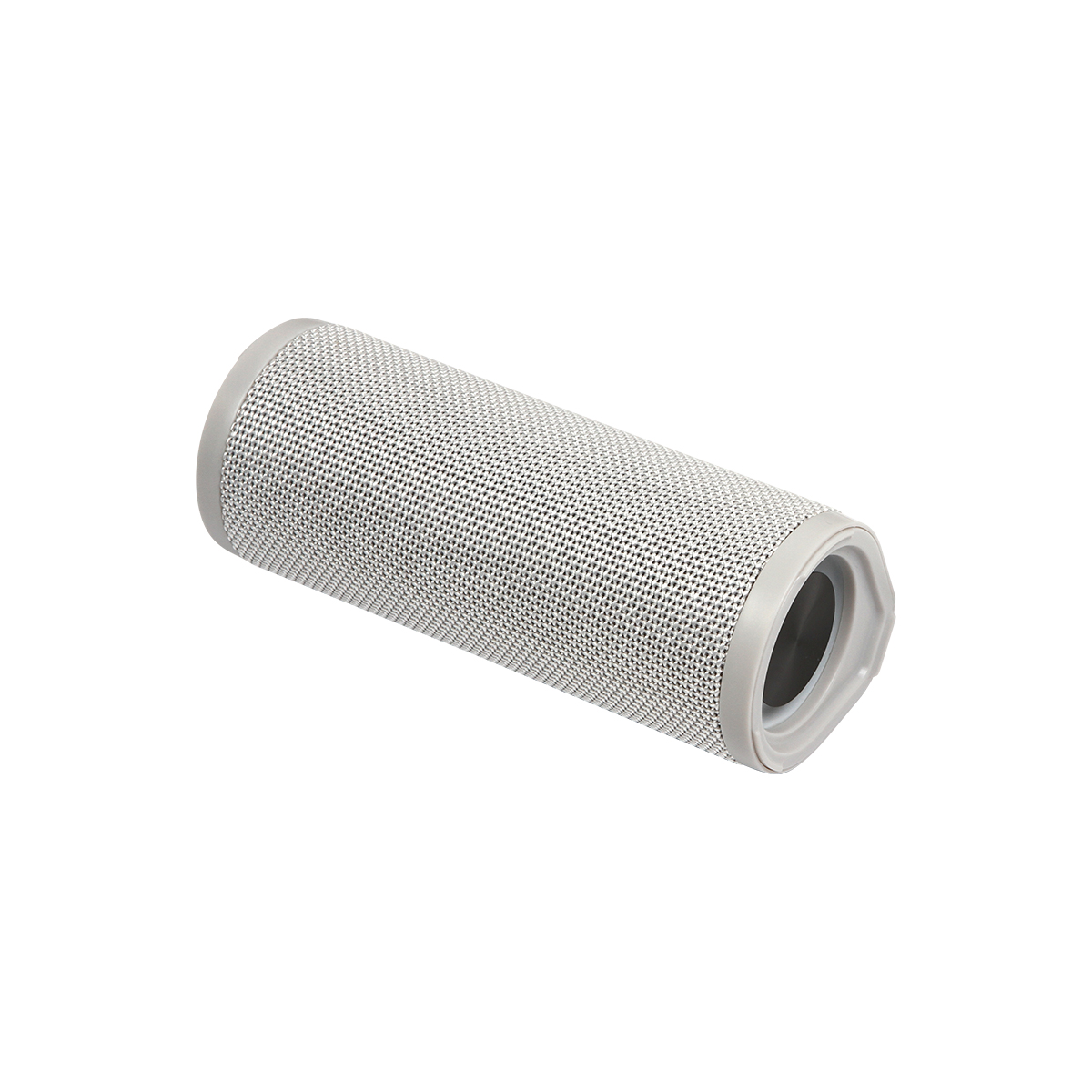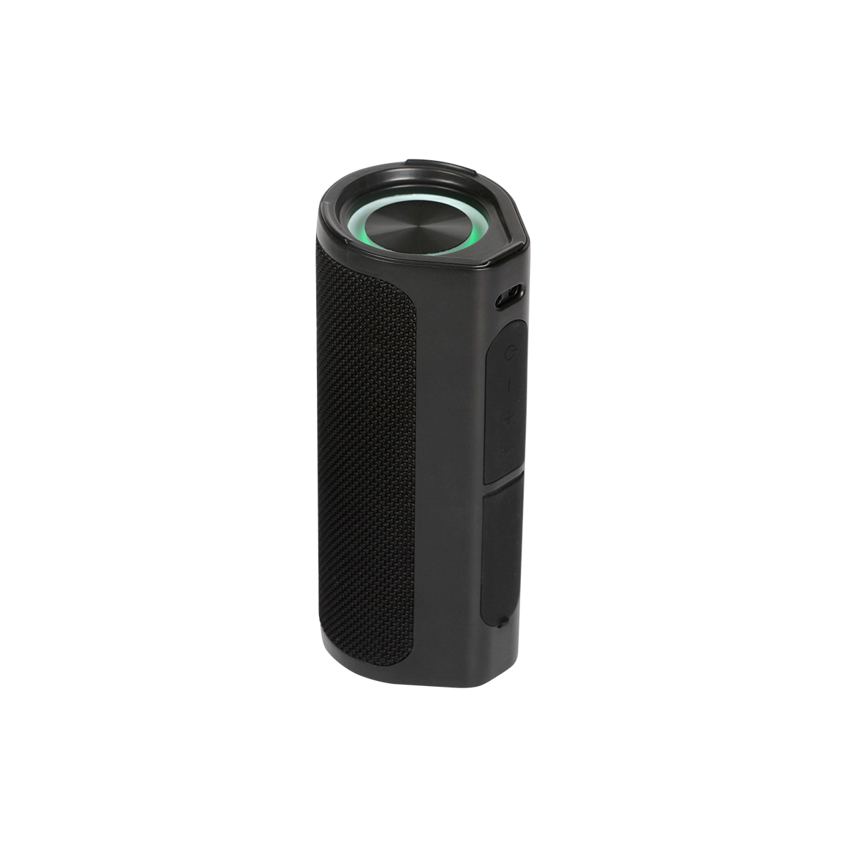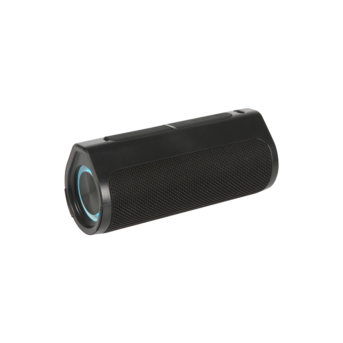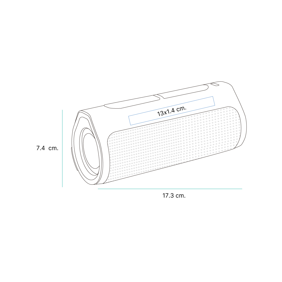 Bocina con conexión de sonido sin cables, cilindrica con radio FM y entrada para tarjeta TF, fabricada en ABS, silicón y tela. Con iluminación en los laterales, fabricada en ABS, silicón y tela. Cable USB incluido.