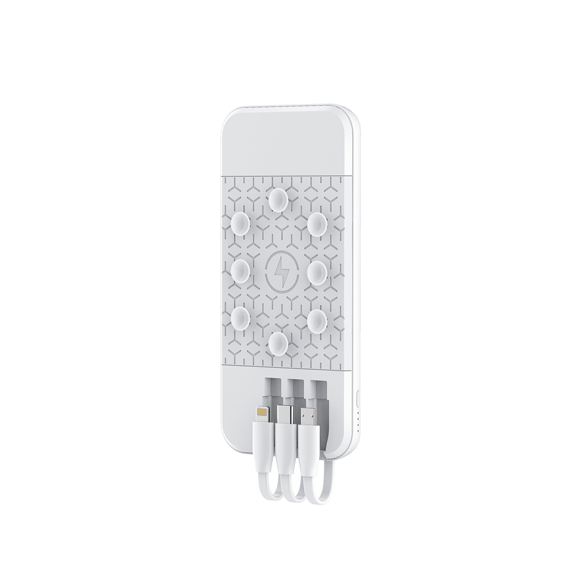 Con una capacidad de 10,000 mAh, fabricada en plástico ABS, un material duradero y resistente, está equipada con ventosas en la parte posterior (estas ventosas permiten adherir el power bank a la superficie de tu dispositivo móvil ), con una inclusión de 3 cables de carga integrados ( micro USB, USB-C y Lightning) compatible con dispositivos Apple y android. Incluye caja de cartón individual. Es un compañero confiable para mantener tus dispositivos móviles cargados en cualquier momento y luga