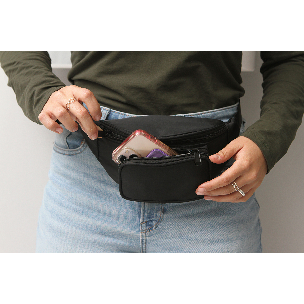 Bolsa tipo cangurera fabricada en nailon, con tres compartimentos con cierre, ideales para guardar artículos pequeños como audífonos, celular, monedas, lentes, etc