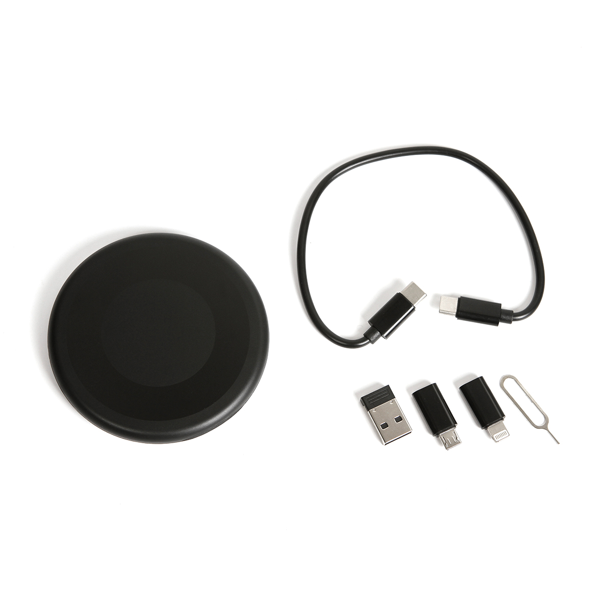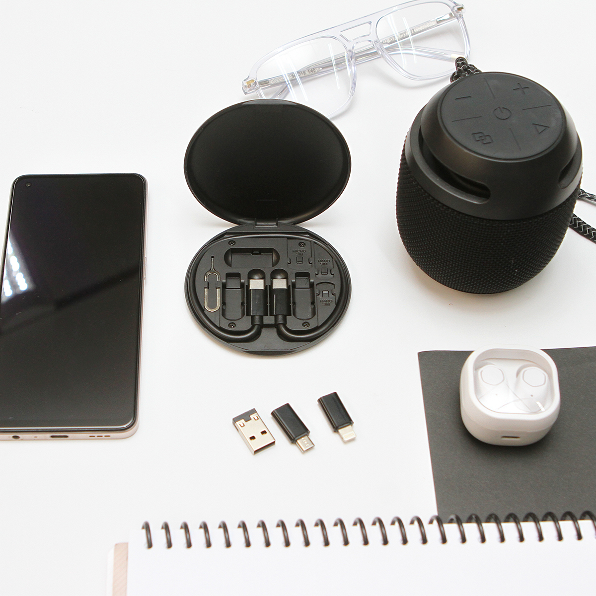 Estuche liviano y portátil multifuncional para almacenamiento que ofrece una solución práctica para necesidades de carga rápida y transferencia de datos, incluye: Cable USB C Macho - USB C Macho, con Adaptador USB A/Micro USB/Lightning con USB.