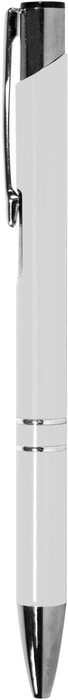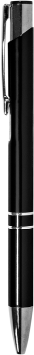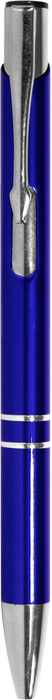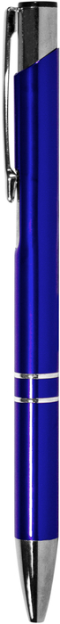 Aluminio. Cuerpo metálico de color. Clip, punta, y pulsador color plata. En el centro del bolígrafo cuenta con dos arandelas y más arriba finalizando el clip cuenta con una muesca color plata. Tinta negra
