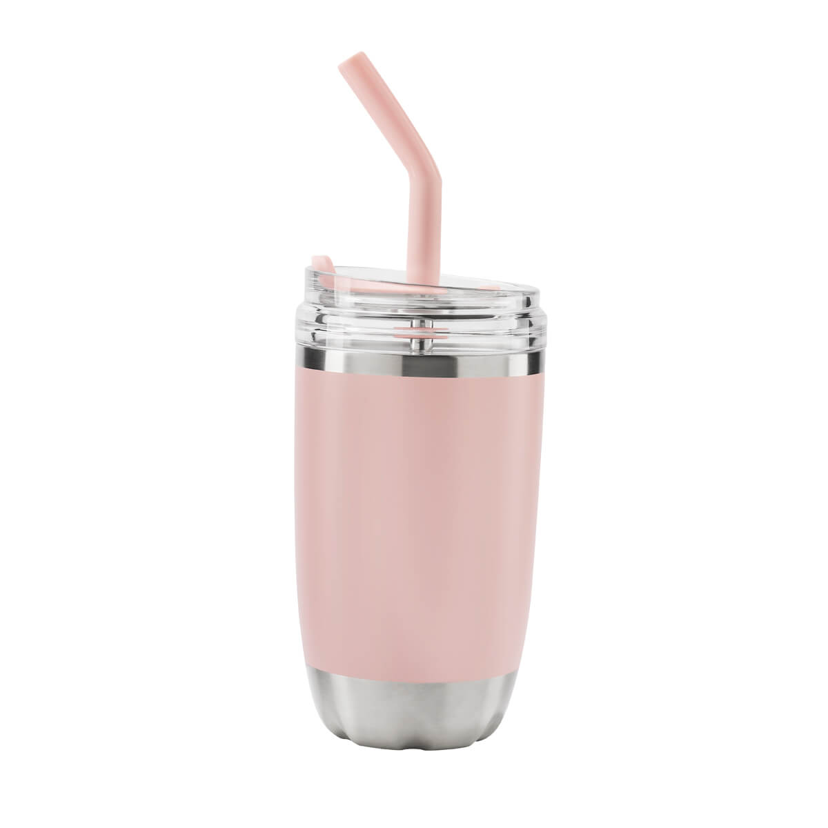 Doble pared. Cerrado al vacío. Pared interna y externa de acero inoxidable. Tapa push de plástico con sobretapa de silicón removible y ranura especial con tapón para popote. Incluye popote metálico con boquilla de silicón
