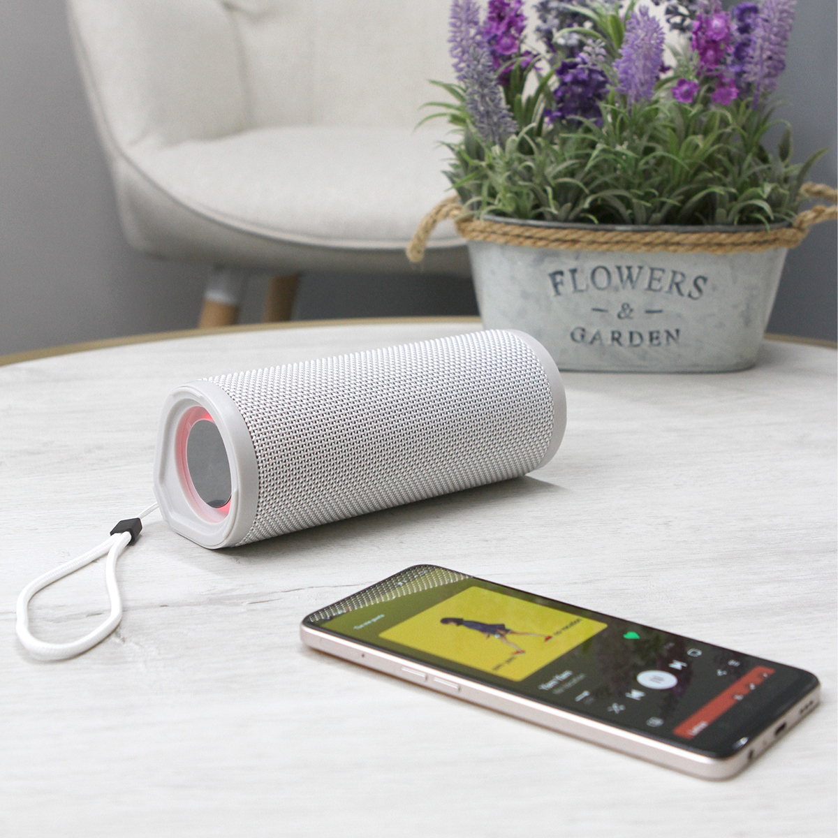 Bocina con conexión de sonido sin cables, cilindrica con radio FM y entrada para tarjeta TF, fabricada en ABS, silicón y tela. Con iluminación en los laterales, fabricada en ABS, silicón y tela. Cable USB incluido.