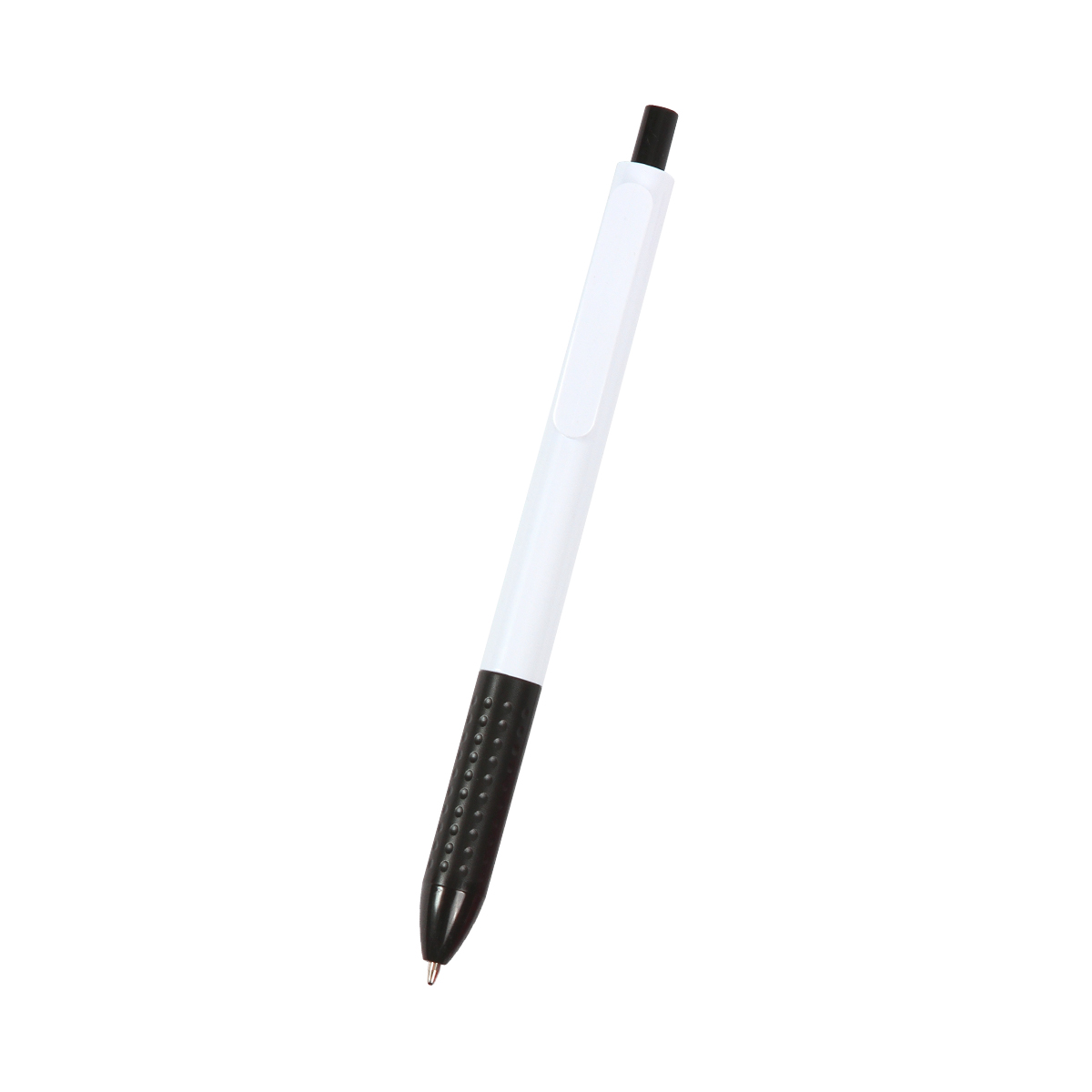 Bolígrafo con barril fabricado en plástico ABS color blanco, con punta y botón en diferentes colores a elegir, mecanismo de botón. Tinta de escritura color negro.