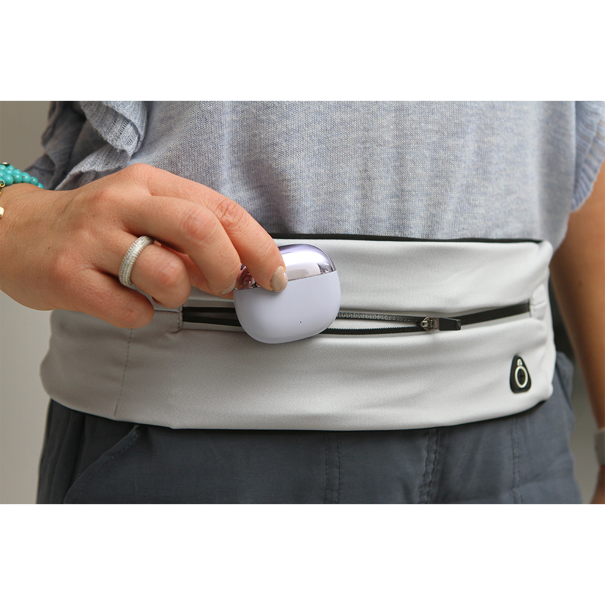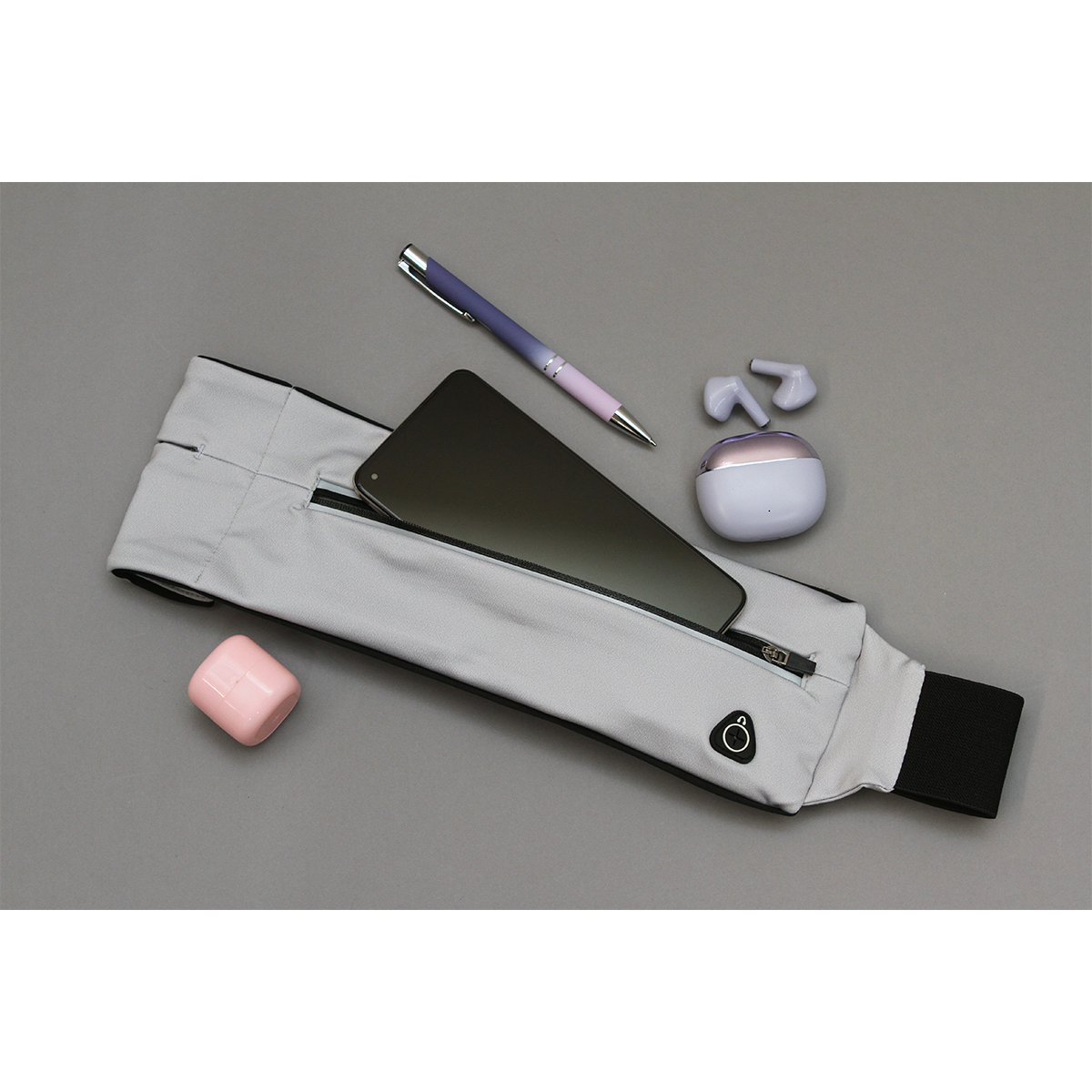 Cangurera con cierre al frente, salida para audífonos, fabricada en poliéster y spandex, diseño resistente y ergonómico, ideal para el uso diario. Incluye correa ajustable.
