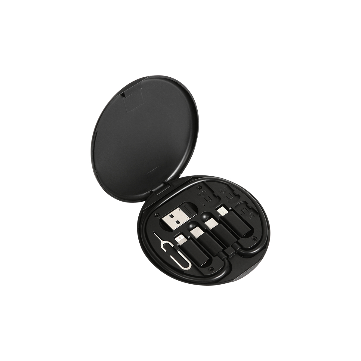 Estuche liviano y portátil multifuncional para almacenamiento que ofrece una solución práctica para necesidades de carga rápida y transferencia de datos, incluye: Cable USB C Macho - USB C Macho, con Adaptador USB A/Micro USB/Lightning con USB.