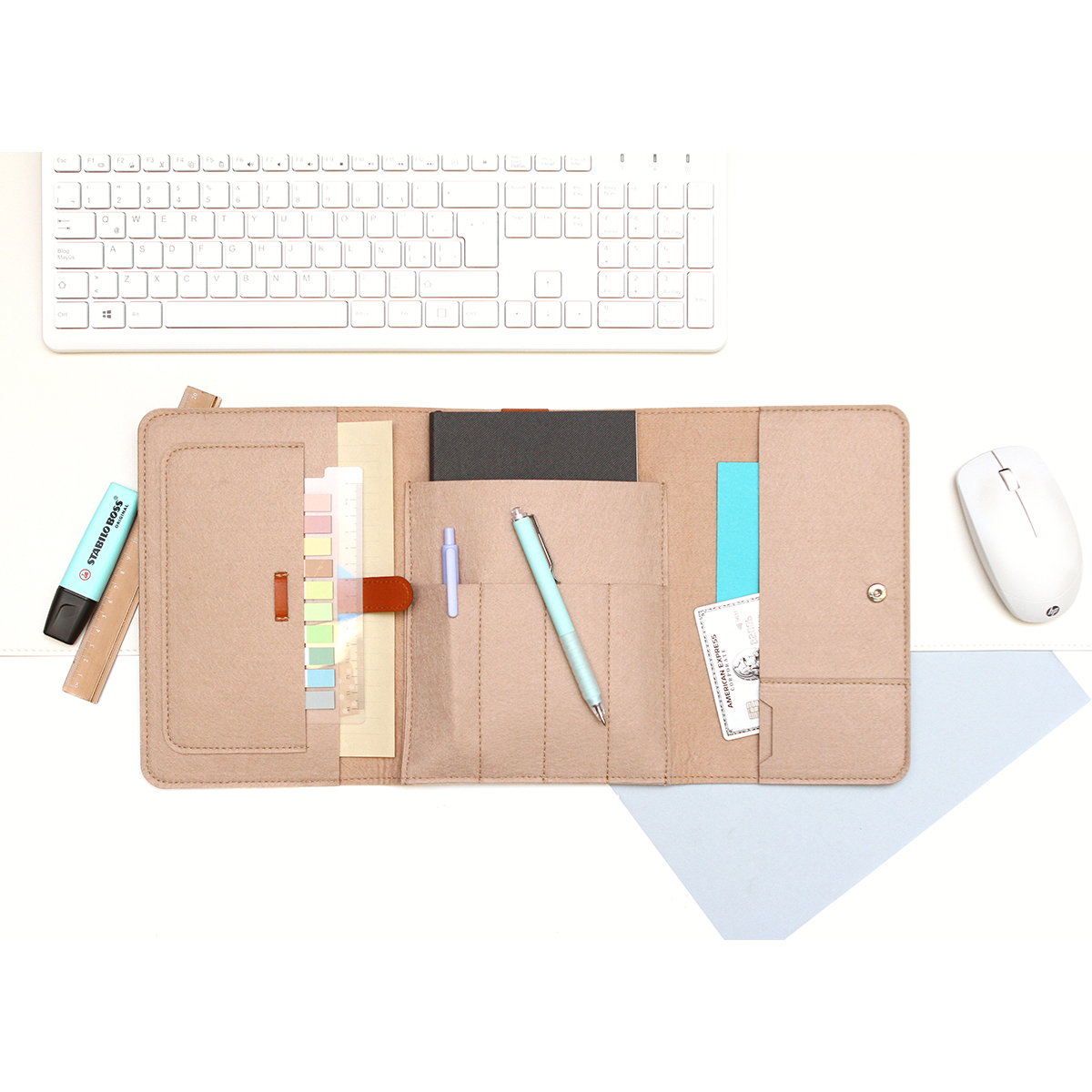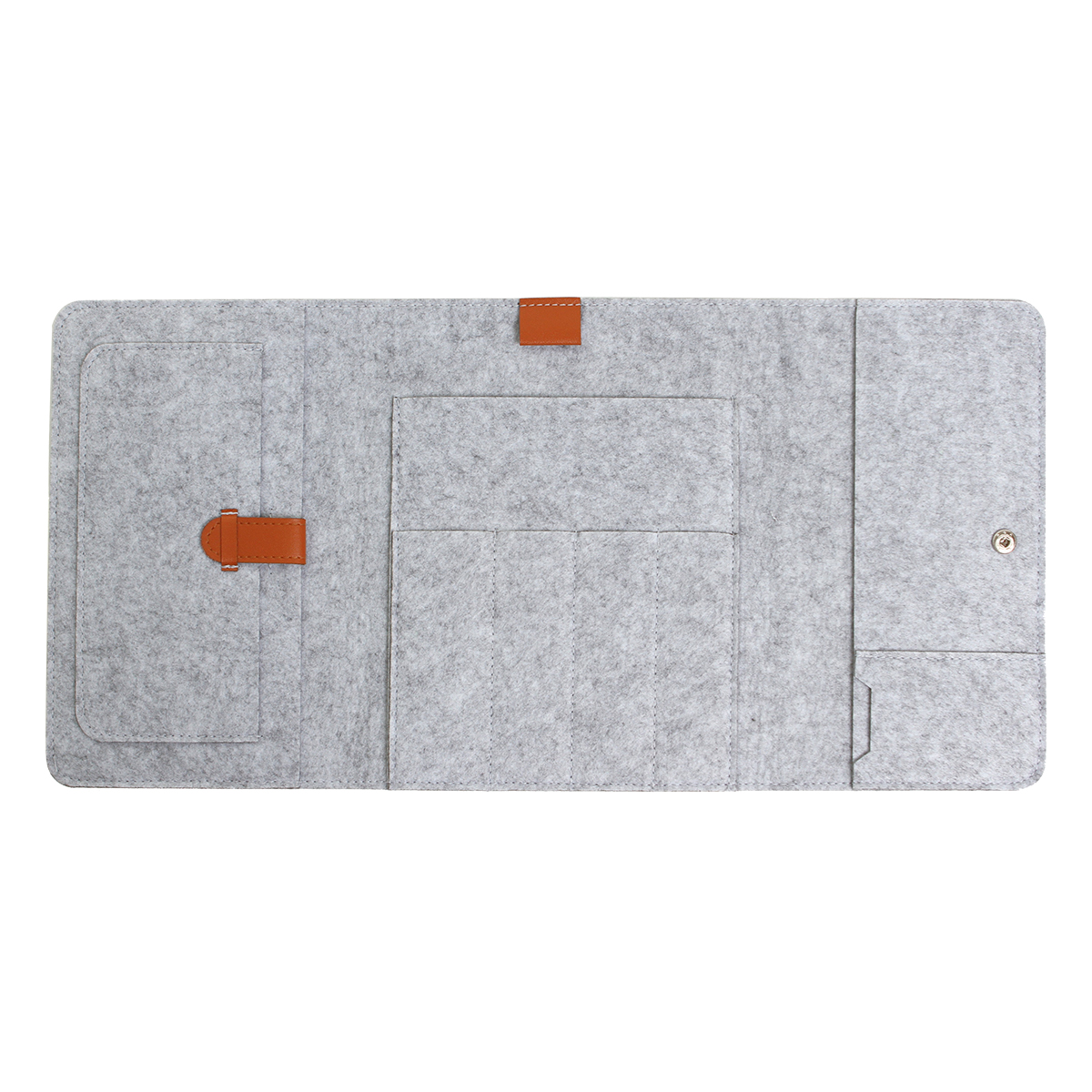 Carpeta fabricada en fieltro, con cierre de broche. Incluye cuatro compartimentos internos para documentos u otros objetos. Además de compartimentos para bolígrafos o lapiceros y espacio para guardar tarjetas.