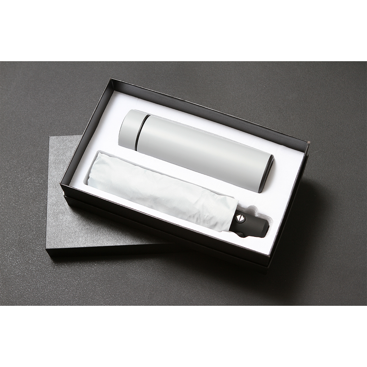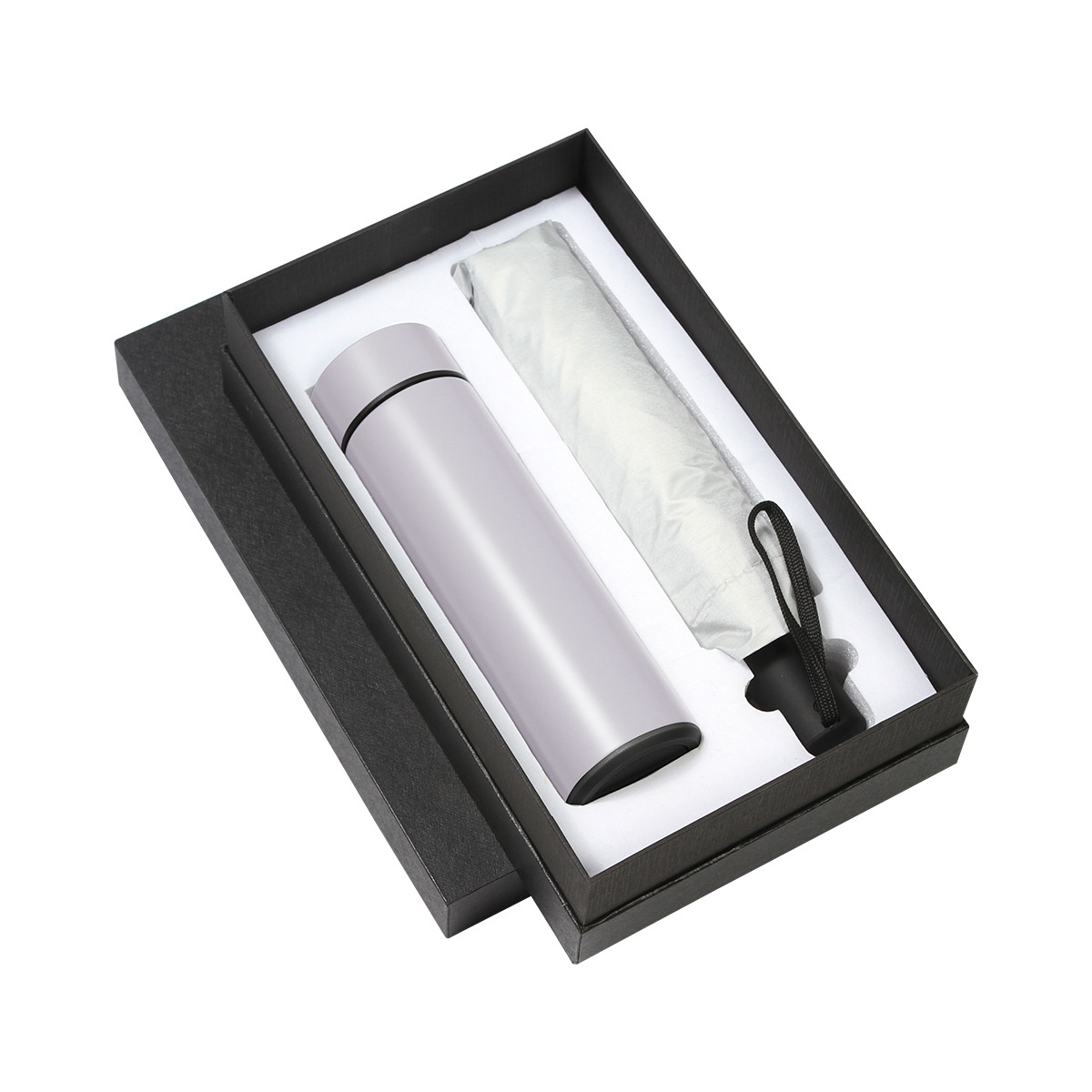Set de regalo con paraguas de poliéster con apertura automática y termo inteligente de acero inoxidable doble pared; con pantalla LED indicadora de temperatura interior en la tapa. Fabricado en materiales de grado alimenticio, mantiene bebidas frías o calientes por un largo tiempo. La batería dura hasta 2 años. No usar en microondas. Capacidad de 500 ml. Incluye caja de cartón. Cuenta con protección UV.