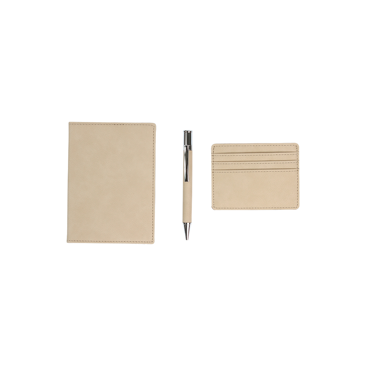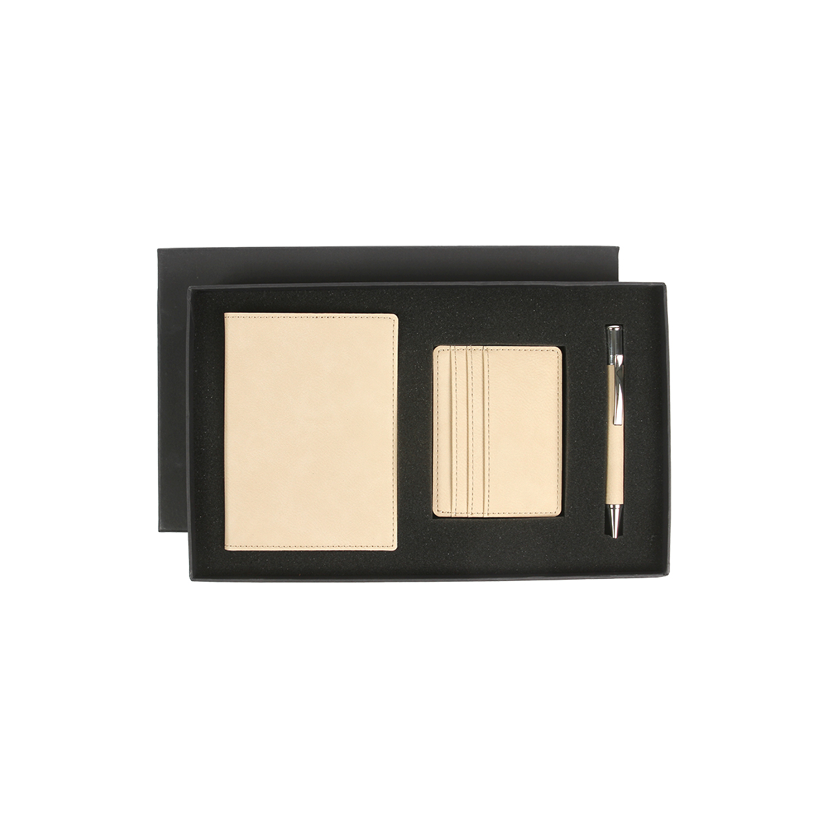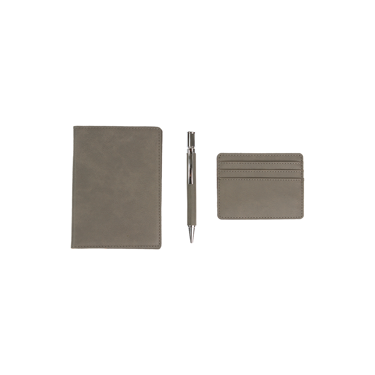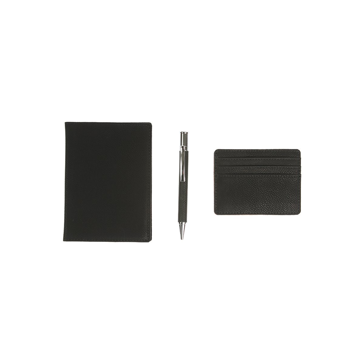 Set de regalo incluye un porta pasaporte, tarjetero con cuatro compartimentos, ambos artículos fabricados en curpiel. Incluye también un bolígrafo fabricado en metal con tinta de escritura negro.