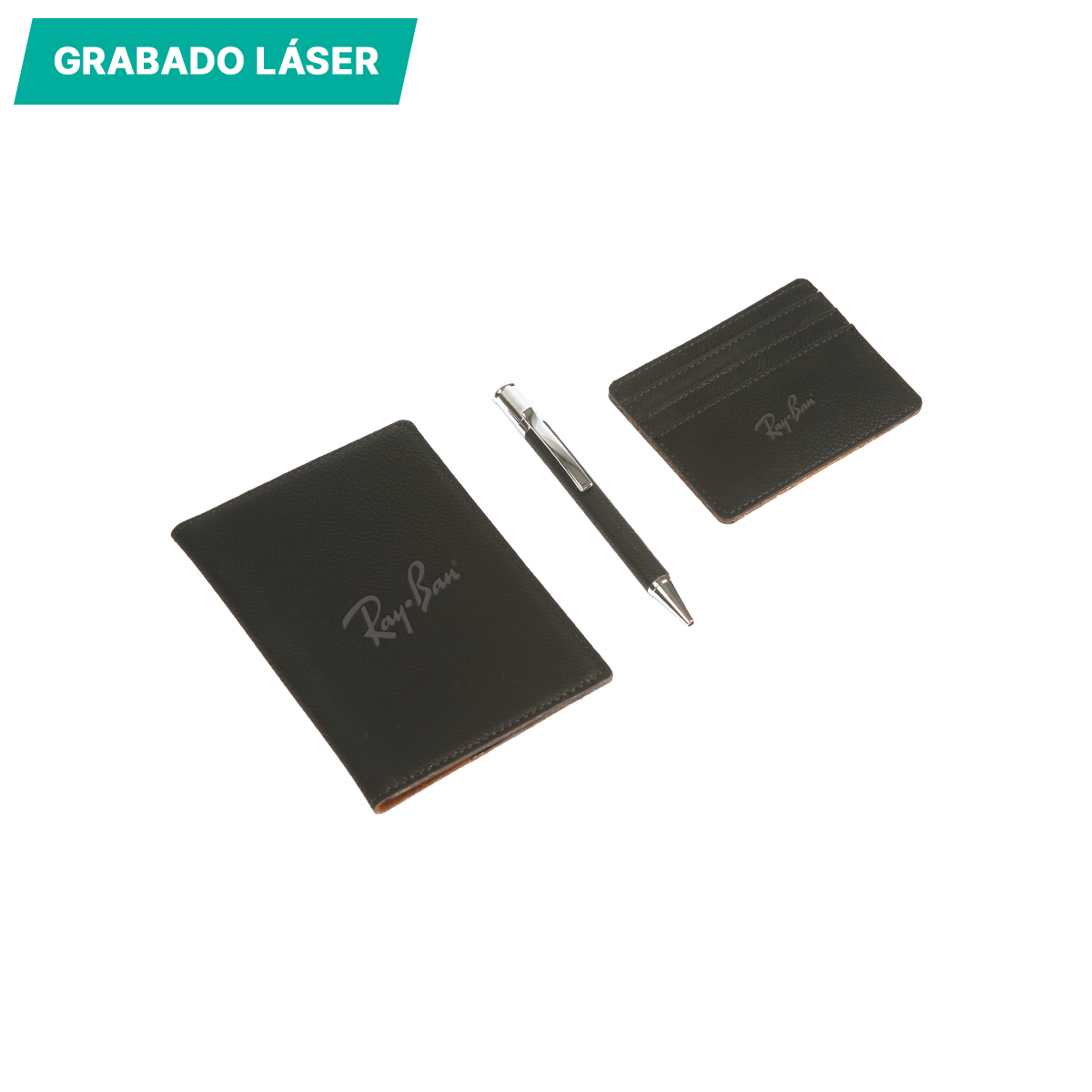 Información de impresión: Técnica: Grabado Laser - Serigrafia Área: Porta pasaporte: 10x7 cm. | Bolígrafo: 4x.7 cm. | Tarjetero: 7x5 cm.