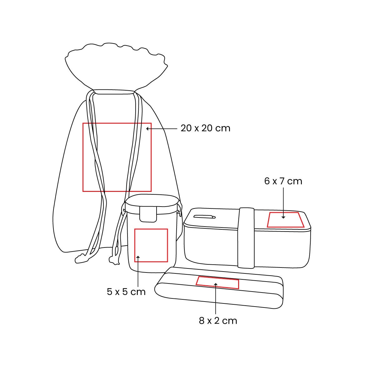 Información de impresión: Técnica: Serigrafía en Lonchera, Contenedor y Cubiertos / Bordado y Serigrafía en Bols Área: 20 x 20 cm Bolsa / 6 x 7 cm Lonchera / 5 x 5 cm Contenedor / 8 x 2 cm Cubiertos
