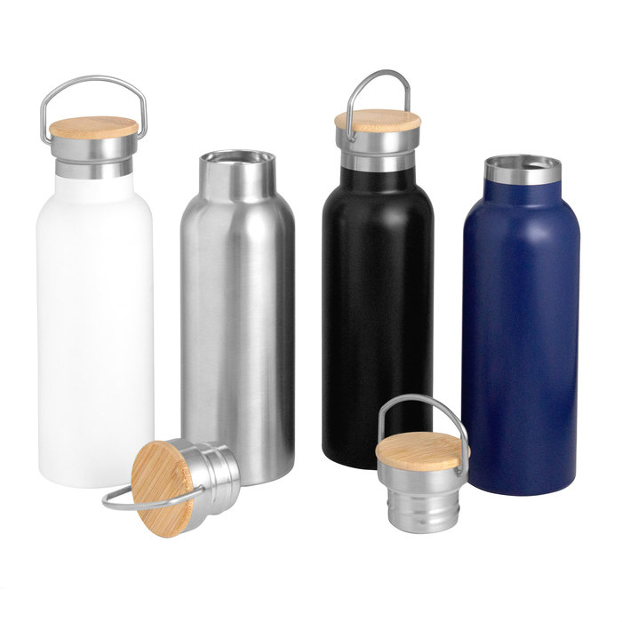 ,2 x 22,3 cm. Capacidad 550 ml. Acero inoxidable. Botella térmica doble pared sellada al vacío. Interior en acero 304 y exterior en acero 201. Tapa de acero inoxidable con manija metálica rebatible y detalles en bambú. Anillo de silicona antiderrame. Mantiene hasta 12 hs