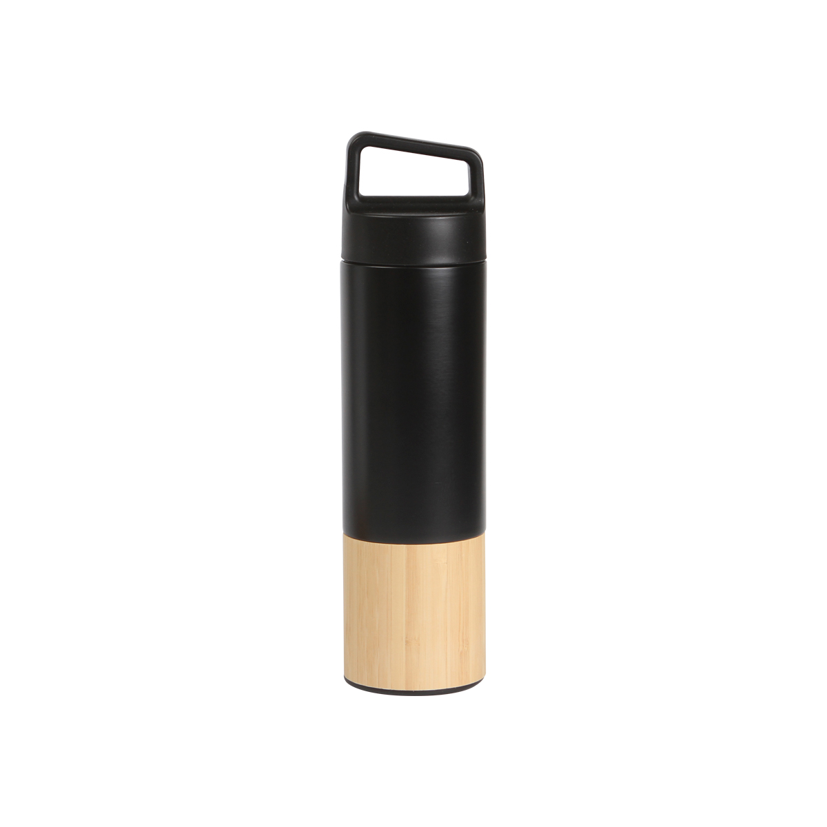 Termo de acero inoxidable doble pared, detalle de bambú en la parte baja y tapa de plástico con agarradera. Fabricado en materiales de grado alimenticio, mantiene bebidas frías o calientes por un largo tiempo. No usar en microondas. Capacidad de 500 ml. Incluye caja de cartón individual.