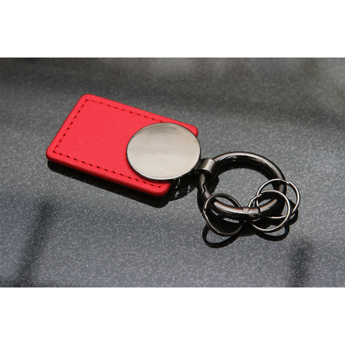 Llavero fabricado en metal y curpiel. Incluye tres pequeños aros y el arillo principal es fácil de manipular. Este diseño innovador incorpora elementos metálicos cromados, que añaden un toque de elegancia y durabilidad al llavero.